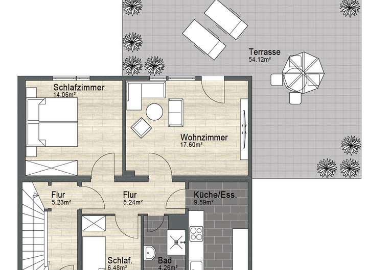 Ein pflegeleicht und liebevoll angelegter Garten lässt die Herzen aller höher schlagen. Dieser bieten Ihnen durch seine Uneinsehbarkeit und Weitsichtigkeit viel Privatsphäre und besticht durch die große Terrasse.