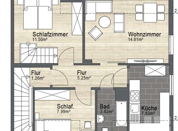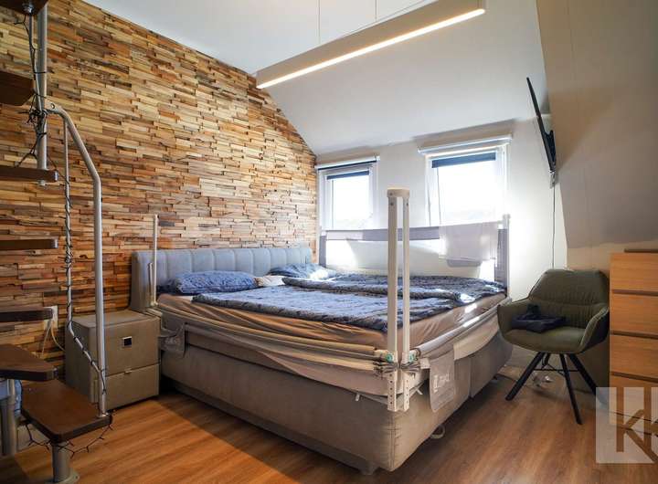 Über eine Holztreppe gelangen Sie in das Obergeschoss, das mit seinem durchdachten Grundriss überzeugt. Dort erwarten Sie zwei einladende Schlafzimmer, eine moderne Küche sowie ein großzügiges Wohnzimmer, das ein angenehmes Wohnambiente schafft.