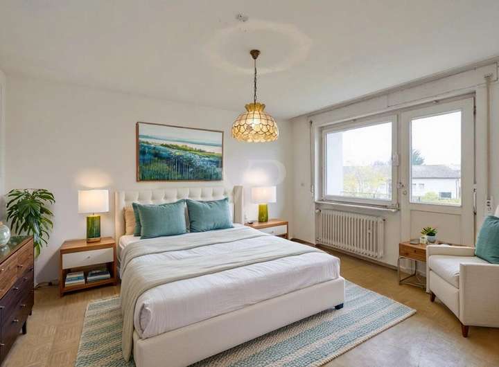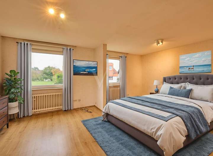 Im Erdgeschoss befinden sich zwei großzügige Schlafzimmer, die viel Raum für individuelle Einrichtungsideen zur Verfügung stellen. Eines der Zimmer verfügt über einen Zugang zum Balkon, der einen schönen Blick in den Garten eröffnet. Direkt an dieses Zimmer grenzt das Tageslichtbad und sorgt damit für zusätzlichen Komfort auf dieser Etage.