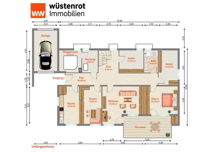 Das Untergeschoss ist aufgeteilt in einen Wohnbereich sowie in einen Kellerbereich. Hier befinden sich zwei Schlafzimmer, ein Wohnzimmer, eine Küche sowie ein Bad. Dieser Wohnbereich verfügt über einen separaten Eingang sowie über einen Zugang über das Erdgeschoss. Eine große Terrasse erreicht man vom Wohnzimmer sowie vom größeren Schlafzimmer aus.