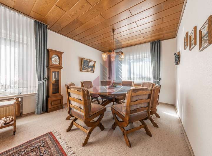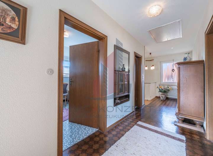 Willkommen in Ihrem neuen Zuhause – einem gemütlichen Einfamilienhaus mit liebevoll angelegtem Garten. Schon beim Betreten spüren Sie die Sorgfalt und Liebe zum Detail: Helle Räume, klassische Holzakzente und eine warme Wohnatmosphäre verleihen der Immobilie Charakter und Gemütlichkeit. Das Haus bietet reichlich Platz für die ganze Familie, flexible Nutzungsmöglichkeiten und einen ausbaufähigen Spitzboden. Mehrere Zugänge zum Garten, großzügige Wohnflächen und durchdachte Raumaufteilung machen diese Immobilie zu einem echten Wohntraum. Im Erdgeschoss betreten Sie das Haus über eine Holztür mit Glaselementen. Zur linken Seite befinden sich das Gäste-WC und der Durchgang zur Garage mit elektrischem Tor und direktem Gartenanschluss. Über denselben Flur erreichen Sie die überdachte, geschlossene Terrasse mit Fußbodenheizung sowie ein weiteres Zimmer, ideal als Homeoffice oder Gästezimmer. Ein weiteres Zimmer mit Terrassenzugang, die Küche mit Holzvertäfelung und das großzügige Wohnzimmer mit Essbereich runden das Erdgeschoss ab. Das Obergeschoss bietet ein Gäste-WC, drei Schlafzimmer – eines mit Balkon – sowie ein großes Badezimmer mit Badewanne, Dusche und Doppelwaschbecken. Der isolierte Spitzboden bietet Potenzial für ein bis zwei zusätzliche Zimmer. Im voll unterkellerten Haus finden Sie eine Waschküche, Heizungsraum, Partykeller/Hobbyraum und einen weiteren Raum zur freien Nutzung. Der Außenbereich überzeugt mit gepflegtem Vorgarten, einem weitläufigen Garten mit Hecke, Rasenflächen und gepflastertem Rundweg, ideal zum Spielen, Entspannen oder für gemütliche Gartenabende. Sie wollen mehr sehen? Dann kontaktieren Sie uns über das Kontaktformular und Sie erhalten ein Exposé mit weiteren Informationen.