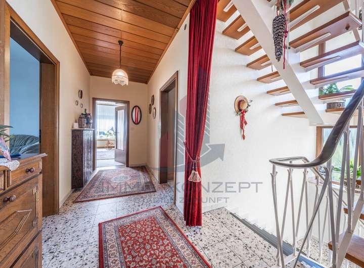•Überdachte und geschlossene Terrasse mit Fußbodenheizung •Großzügiger Grundriss mit flexibler Raumaufteilung •Garage mit direktem Gartenzugang •Drei Schlafzimmer + Arbeits-/Gästezimmer •Zwei Gäste-WCs und ein großes Bad mit Dusche & Wanne •Isolierter Spitzboden mit Ausbaupotenzial •Voll unterkellert und vielseitig nutzbar •Gepflegter Garten mit Rundweg und Hecke •Helle Wohnräume mit gemütlichen Holzdetails In den Jahren gab es mehrere Sanierungsmaßnahmen. Diese haben wir für Sie einmal aufgeführt: •Anbau Zimmer (1977) •Fenster neu im Treppenhaus (1991) •Hauseingangstür neu (1991) •alle Fenster neu im Obergeschoss außer ein Schlafzimmer (2010-2011) •Ölheizung neu (2021) •Eingangsstufe neu (2021) •elekt. Garagentor •Dachboden isoliert