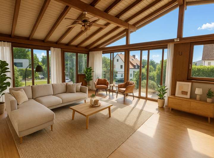 Zur Ausstattung zählen u. a. eine moderne Luftwärmepumpen-Zentralheizung, Kaminofen, Sauna, Wintergarten, Keller sowie eine Garage – hochwertiges Wohnen mit spürbarer Wohlfühlatmosphäre.