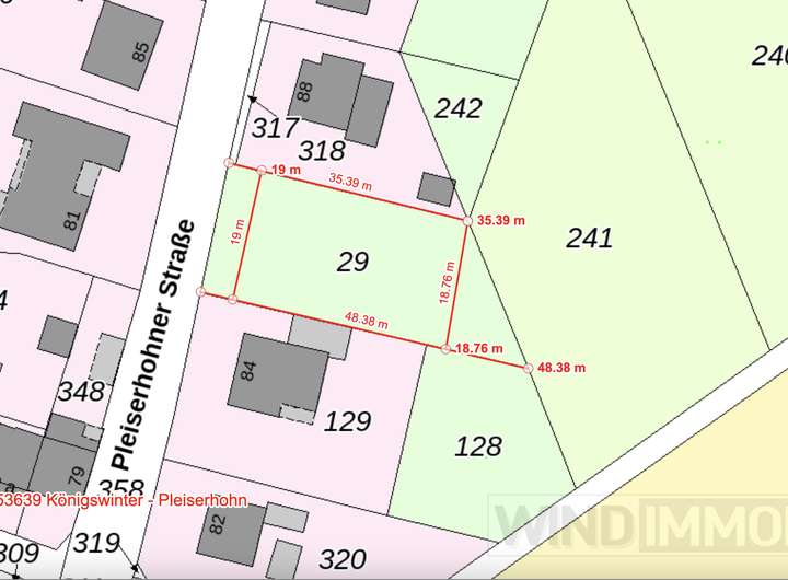 Wir bieten Ihnen ein tolles Baugrundstück ganz in der Nähe von Oberpleis an. Sie genießen hier von Ihrer künftigen Süd-West-Terrasse einen tollen Blick die angrenzenden Felder. Bei der Nachbarbebauung handelt es sich ausschließlich um klassische Einfamilienhäuser. Das Grundstück misst 785qm. Die Breite beträgt ca. 19m und die mittlere Tiefe ca. 41m. Das Grundstück kann geteilt werden, so dass eine Bebbauung mit einem Doppelhaus möglich ist.