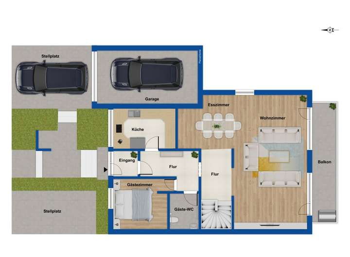 Erdgeschoss: Großzügiger Wohn- und Essbereich, durch große Fenster frontales Licht, Zugang zu einem großen Balkon, Küche, Gäste-WC und ein Büro bzw. Gästezimmer, ideal nutzbar auch als Home-Office,.