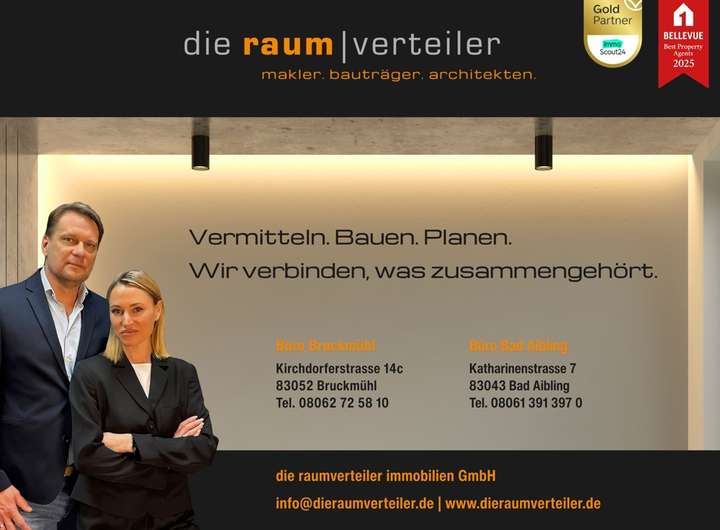 Herzlich willkommen bei der raumverteiler immobilien GmbH in Bruckmühl. Wir sind Ihr Premium Immobilienmakler, wenn es um die Beratung oder den Verkauf einer hochwertigen Immobilie in der Region von Rosenheim über Bad Aibling, Feldkirchen-Westerham bis nach München geht.