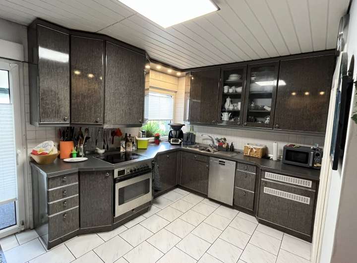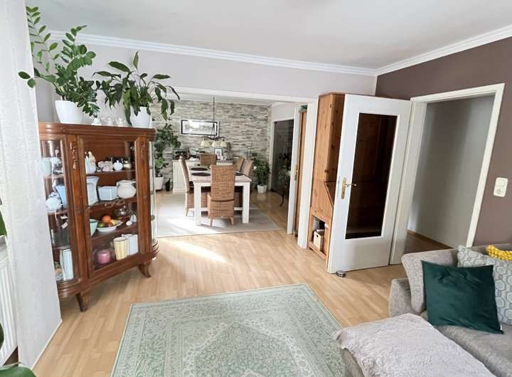 Der Wohn-Essbereich wurde vor einigen Jahren durch die Zusammenlegung der beiden straßenseitigen Räume deutlich vergrößert und überzeugt mit Fensterflächen auf allen Seiten, die für ein lichtdurchflutetes Ambiente sorgen. Eine doppelflügelige Glastür führt in den Küchenbereich mit einer sehr hochwertigen Einbauküche.