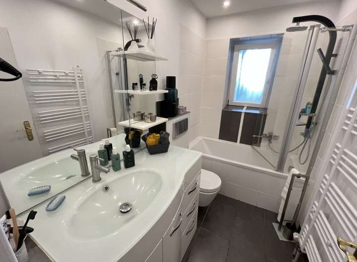 Die Hauptwohnung erstreckt sich über das erste Obergeschoss sowie das Dachgeschoss und bietet insgesamt fünf Zimmer, zwei Bäder und Zugang zur großzügigen Dachterrasse.