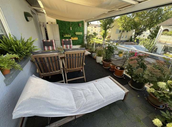 Von hier aus gelangen Sie auf die große, überdachte und geschützte Dachterrasse mit Blick in die umliegenden Gärten.
