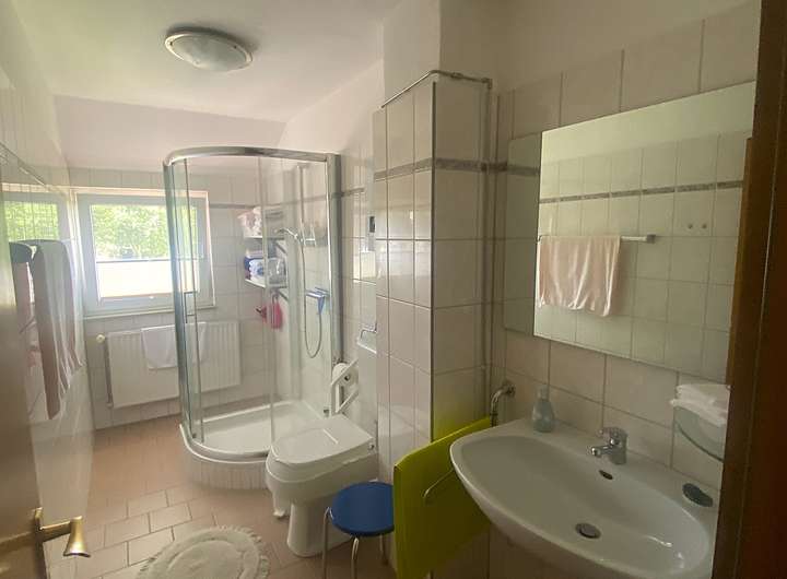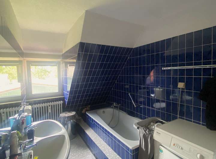 Die Wohnung verfügt über zwei Bäder. Das helle Vollbad befindet sich in einem gepflegten Zustand und ist mit großflächigen Fliesen, einer Badewanne und klassischen Armaturen ausgestattet – ideal für kleine Wellnessmomente im Alltag.