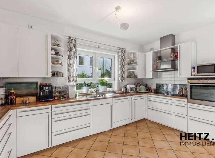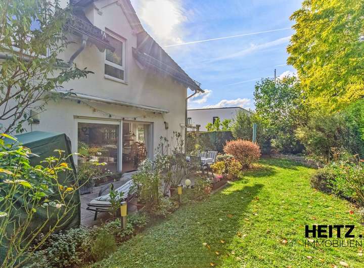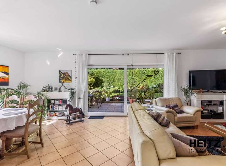 Der anschließende Wohn- und Essbereich besticht durch Offenheit und Licht. Großflächige Schiebeelemente verbinden den Innenraum mit der sonnigen Westterrasse und dem liebevoll angelegten Garten, der durch seine Lage in zweiter Reihe absolute Privatsphäre bietet.