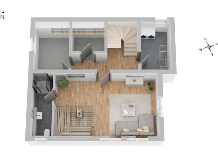 Im Untergeschoss eröffnet sich ein vielseitig nutzbarer Bereich, der Funktion und Wohlbefinden harmonisch verbindet. Neben dem Technikraum und einem zusätzlichen Stauraum befindet sich hier eine großzügige Waschküche mit Waschbecken sowie Anschlüssen für Waschmaschine und Trockner.