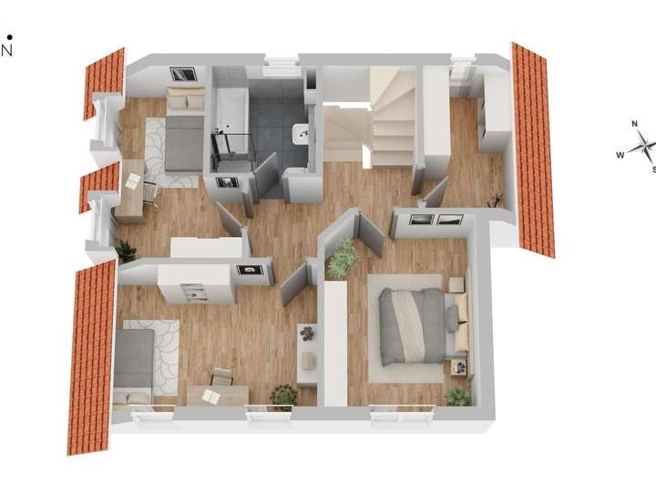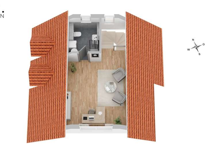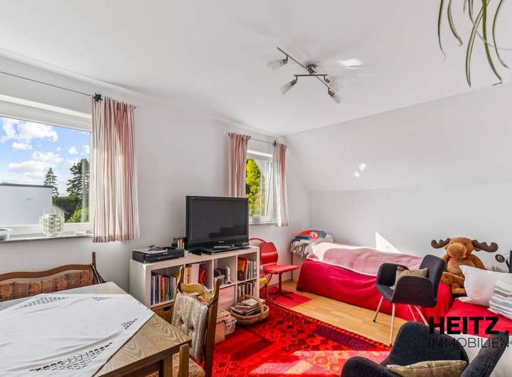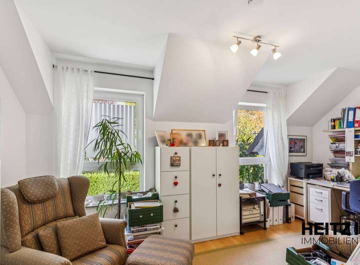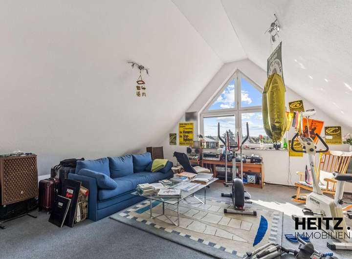 Das ausgebaute Dachgeschoss bietet ein großzügiges Studio mit einer außergewöhnlichen Deckenhöhe von bis zu 3,50 Metern. Das große Giebelfenster lässt den Raum in natürlichem Licht erstrahlen und verleiht ihm eine offene, inspirierende Atmosphäre. Der Bereich eignet sich ideal zum Arbeiten, für Gäste oder als persönlicher Rückzugsort. Ein weiteres Tageslichtbad rundet diese Ebene harmonisch ab.