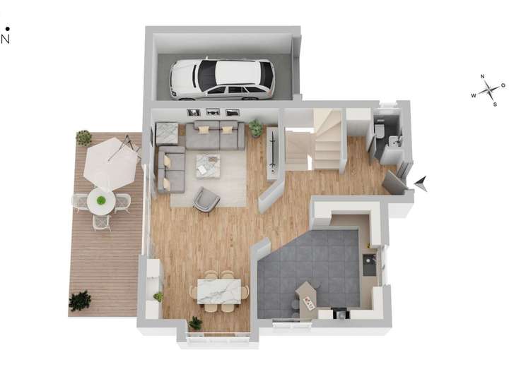 Der großzügige Eingangsbereich öffnet sich zu einer halboffenen Wohnküche mit hochwertiger Einbauküche, großzügiger Arbeitsfläche und Platz für gesellige Stunden. Neben dem Hauseingang befindet sich das Gäste-WC mit Tageslicht sowie eine praktische Garderobennische.