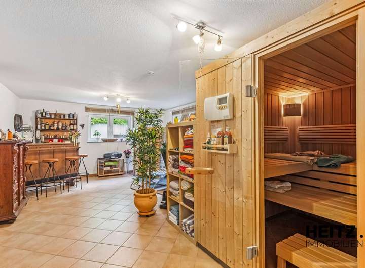 Das Herzstück dieser Ebene bildet der Hobby- und Wellnessraum mit Sauna für bis zu drei Personen. Eine Raumhöhe von etwa 2,40 Metern und drei große Fenster schaffen ein helles, angenehmes Ambiente, das weit über den üblichen Kellerstandard hinausgeht. Das angrenzende und voll ausgestattete Tageslichtbad rundet diesen Bereich perfekt ab. Das Untergeschoss ist ebenso perfekt als Büro geeignet.