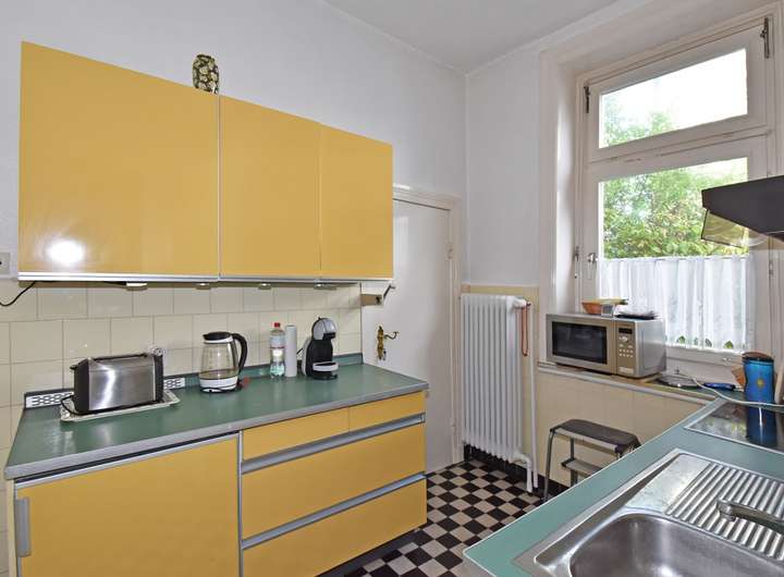 Von der Küche, die über eine separate Speisekammer verfügt, gelangt man in das Treppenhaus sowie auch durch den kleinen Anbau, an einem weiteren WC vorbei, in den rückwärtigen Garten.