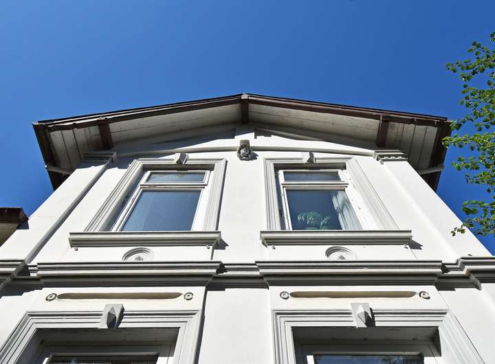 Die dekorative Fassade wird durch ein kräftiges Gesimsband optisch unterteilt während diverse profilierte Rahmungen, Stuckelemente und Verdachungen die Fenster zieren.