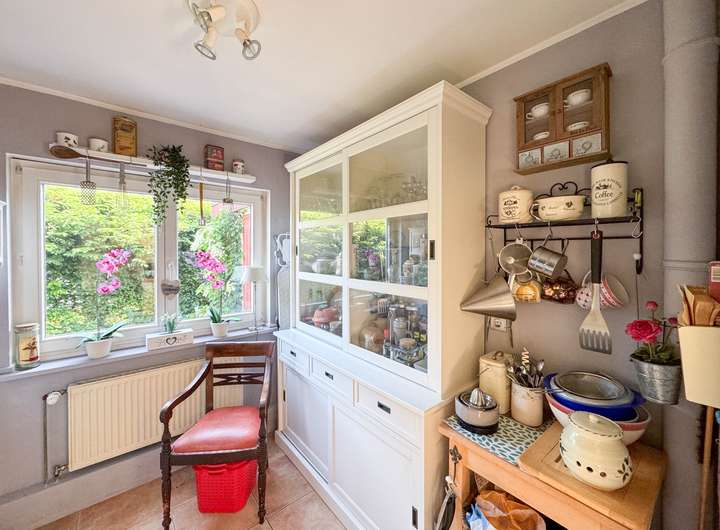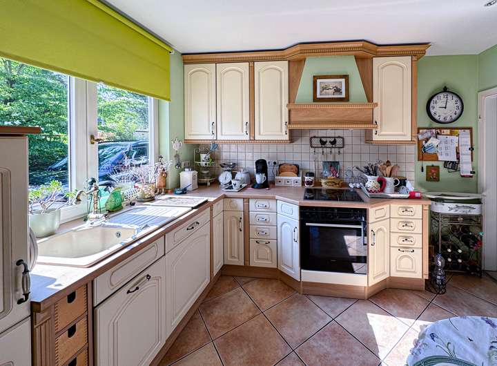 Die geschmackvolle Einbauküche mit Siemens-Geräten und liebevollen Details wie edlen Fliesen machen das Kochen zum Genuss.