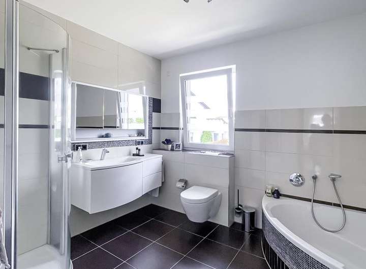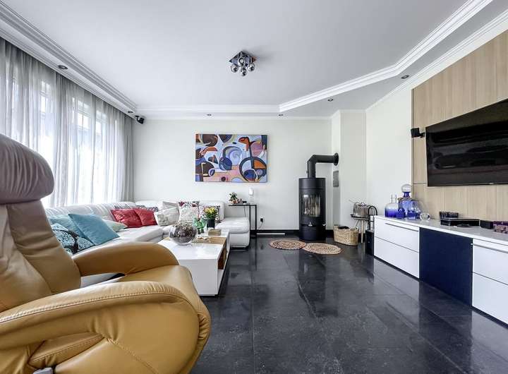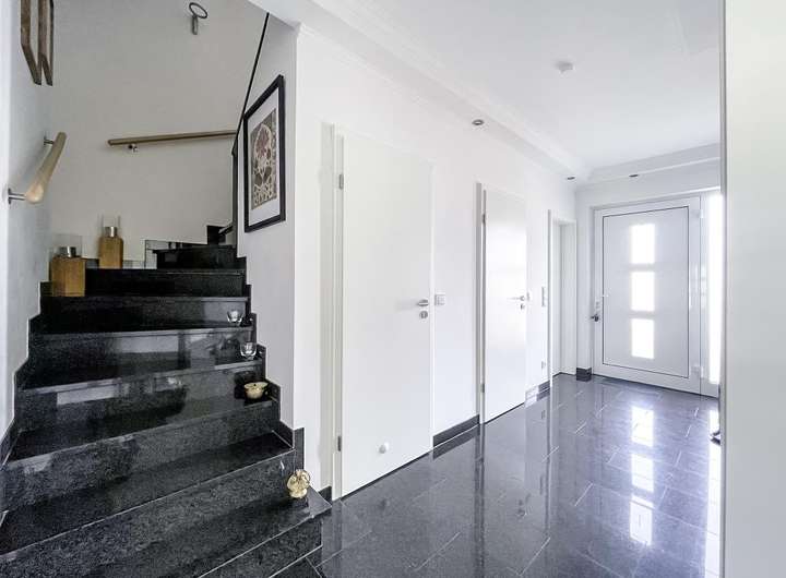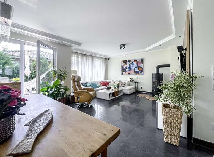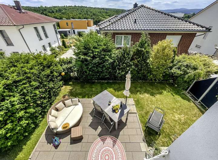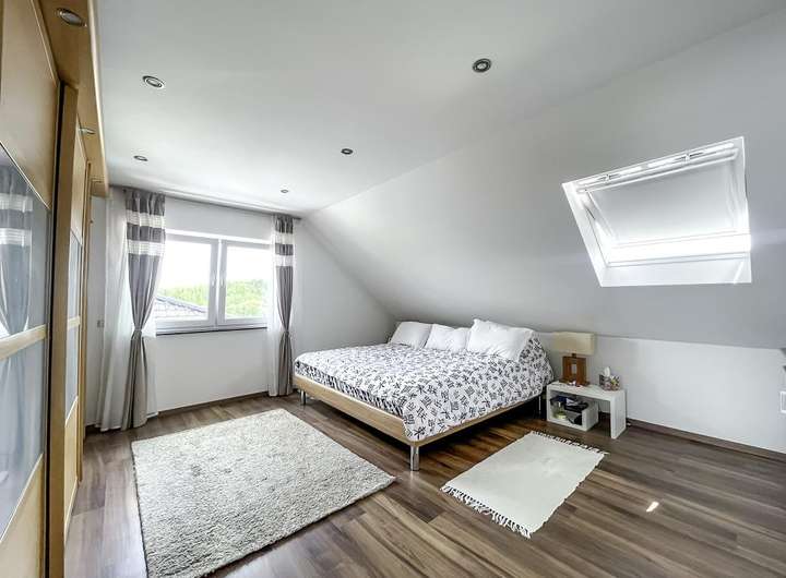 Im Erdgeschoss spielt sich das Familienleben ab. Wohnen, Essen und Kochen gehen hier nahtlos ineinander über – ein großzügiger, offener Wohnbereich schafft Raum für gemeinsames Leben. Der moderne Kamin sorgt für eine behagliche Atmosphäre. Eine maßgefertigte Einbauwand mit großem TV-Screen macht den Raum zum idealen Ort für gemütliche Kinoabende. Die moderne Küche ist hochwertig ausgestattet und in den Wohnraum integriert – ideal für alle, die gerne mitten im Geschehen kochen. Die durchgehende Fußbodenheizung schenkt wohlige Wärme auf allen Etagen und trägt zum rundum angenehmen Wohngefühl bei. Ein Zuhause, das mitdenkt – für die ganze Familie. Im Obergeschoss finden Ihre Kinder ihr eigenes kleines Reich – hell, gutgeschnitten, mit eigenem modernen Badezimmer. Rückzugsorte, die Geborgenheit schenken und gleichzeitig Platz für Träume lassen. Und Sie? Sie genießen Ihre Ruheoase unter dem Dach: ein großzügiges Schlafzimmer mit eigenem, hochwertig ausgestattetem Bad – der perfekte Rückzugsort für Eltern, die sich nach einem langen Tag ein bisschen Wellness zu Hause wünschen. Durch die Südausrichtung ist auch die Terrasse wunderbar lichtdurchflutet– ein Ort für morgendlichen Kaffee, lange Sommerabende. Der Garten ist pflegeleicht und perfekt dimensioniert. Ein Haus ohne Keller, aber mit cleveren Stauraumlösungen: Ein praktischer Abstellraum im Inneren und zusätzlicher Stauraum im angebauten Carport sorgen dafür, dass alles seinen Platz findet – ob Fahrräder, Spielzeug oder Werkzeug!