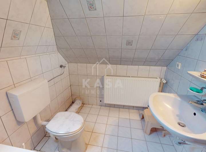 Im Obergeschoss befinden sich insgesamt drei Schlafzimmer. Zwei der Räume verfügen über einen gemeinsamen Zugang zu einem Balkon, der zum Verweilen im Freien einlädt. Das Badezimmer ist mit Badewanne und Dusche ausgestattet und bietet sowohl Komfort als auch Funktionalität. Ein zusätzlicher Dachboden steht als praktische Staumöglichkeit zur Verfügung.