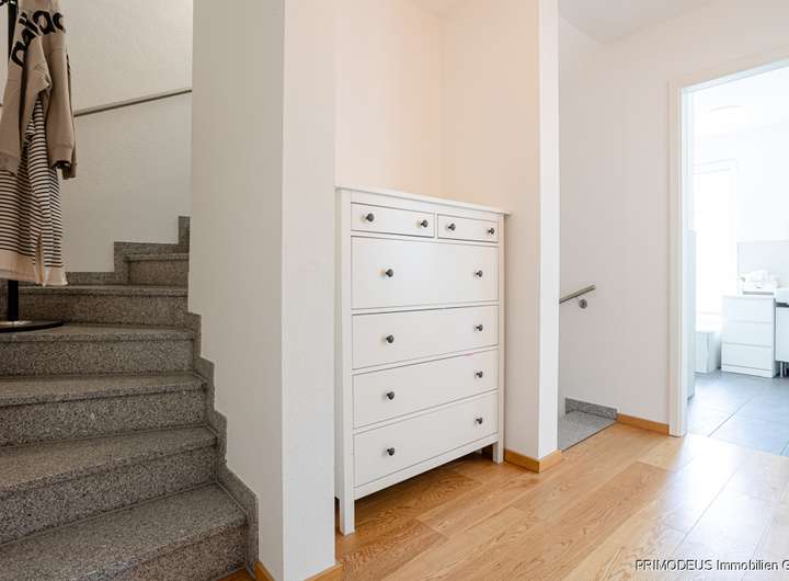In den oberen Etagen befinden sich vier vielseitig nutzbare Schlafzimmer, ein helles Tageslichtbad mit Badewanne und Dusche sowie ein separates Gäste WC. Die Dachterrasse bietet zusätzlichen Freiraum im Grünen und eignet sich wunderbar zum Entspannen mit schönem Ausblick.