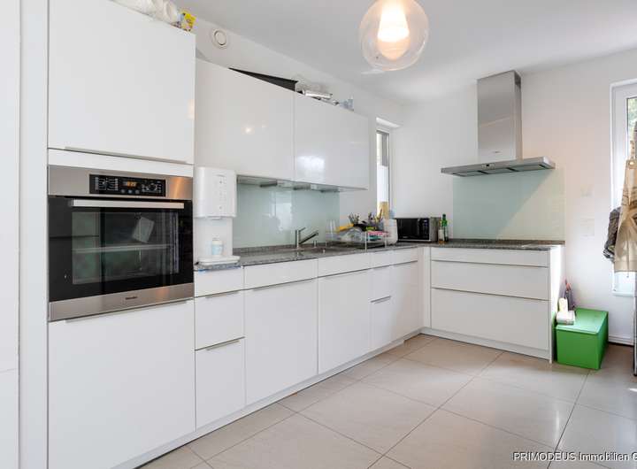 Im Erdgeschoss erwartet Sie ein großzügiger Wohnbereich mit direktem Zugang zur Terrasse und zum liebevoll angelegten Garten. Die offene Einbauküche ist modern ausgestattet und fügt sich harmonisch in den Wohnraum ein. Sie ist ideal für gemeinsames Kochen und gemütliche Abende mit Familie oder Freunden.