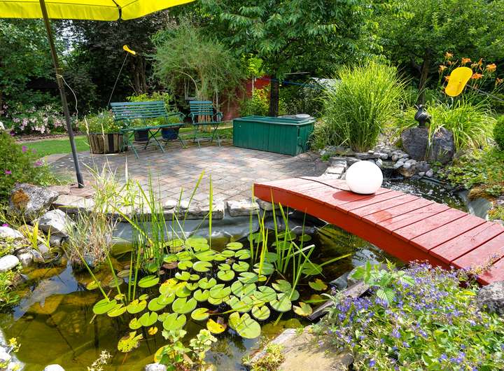 • Außenbereich: große Terrasse, Balkone & Garten mit Teich