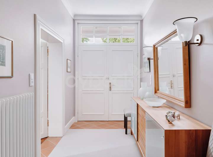Beim Betreten des Hauses spürt man die hochwertige Verarbeitung und die ausgesuchten Materialien, die den besonderen Charakter unterstreichen. Im Erdgeschoss sorgt ein eleganter Kamin aus Carrara-Marmor für eine stilvolle Atmosphäre. Um ihn wieder befeuern zu können, müsste er allerdings nachgerüstet werden. Die echten Cotto-Fliesen aus Italien verleihen den Räumen eine warme, mediterrane Note, während Hamburger Fußleisten den klassischen Look abrunden und perfekt mit dem tropischen Plantagenholz harmonieren, das im Wohn- und Schlafzimmer verlegt wurde.