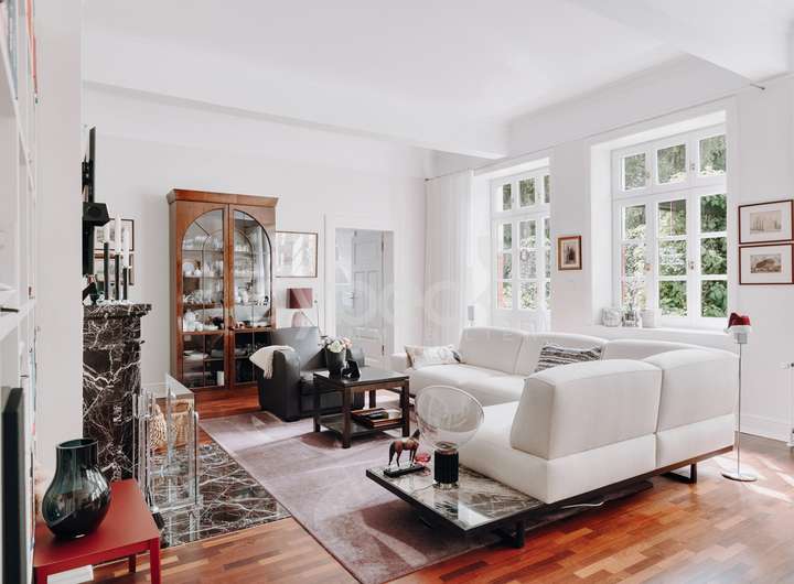 - Großer Wohnbereich mit Kamin aus Carrara-Marmor und Zugang zur Südwest-Terrasse