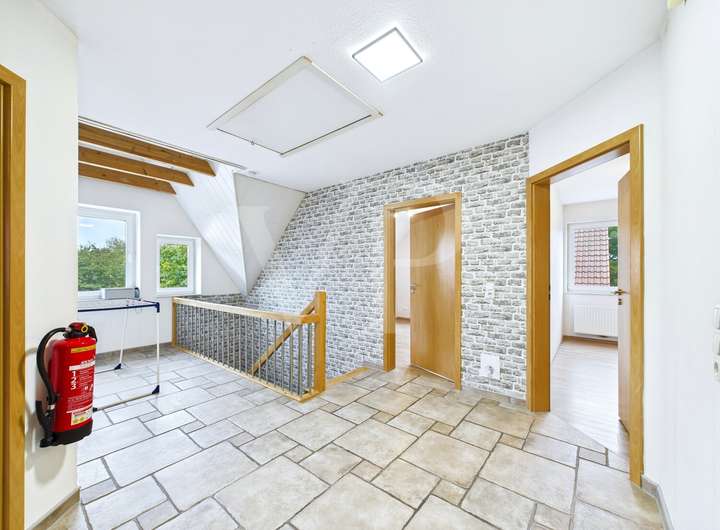 Ein besonderes Highlight ist die Einliegerwohnung über der Garage. Sie bietet vielfältige Nutzungsmöglichkeiten – ob als Gästebereich, separater Wohnraum für ein Familienmitglied oder als Homeoffice. Derzeit ist diese Einheit vermietet.