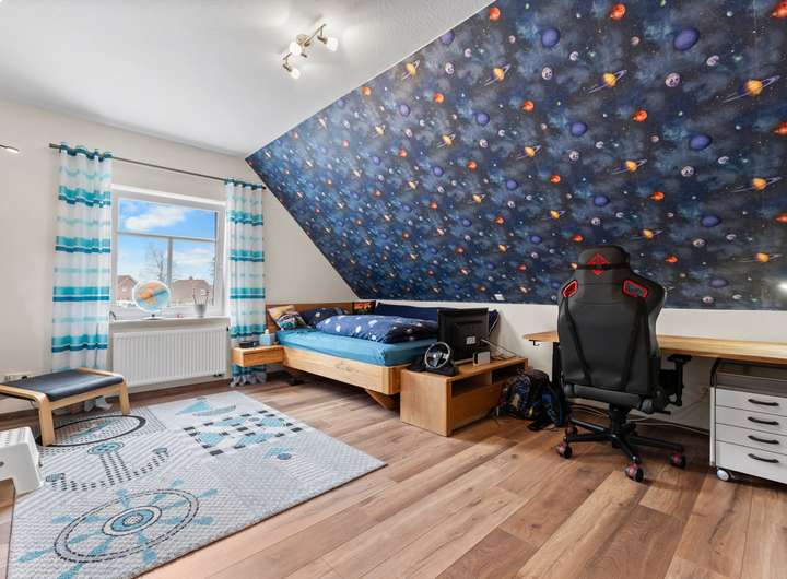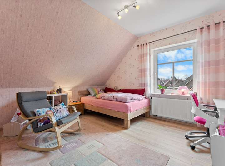 Über eine offene Holztreppe in der Diele erreichen Sie das Dachgeschoss, welches mit drei großzügigen Schlafzimmern, einem zeitlosen Vollbad sowie einem separaten WC überzeugt. Der geräumige Spitzboden bietet darüber hinaus viel Stauraum und erweitert das Platzangebot zusätzlich.