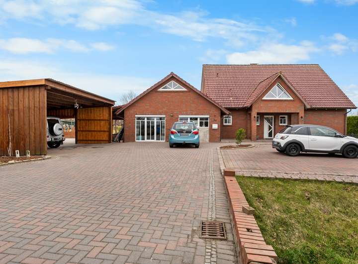 Bereits die großzügige Auffahrt mit ausreichend Stellfläche führt Sie zum überdachten Eingangsbereich. Im Inneren empfängt Sie eine weitläufige Diele, von der aus Sie bequem alle Räume im Erdgeschoss erreichen.