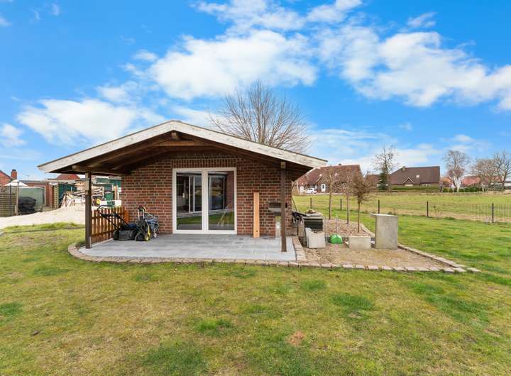 Im Außenbereich erwartet Sie ein liebevoll angelegter Garten mit großer Rasenfläche, mehreren Terrassenbereichen sowie einem gemauerten Blockhaus – perfekt für gesellige Abende oder zusätzlichen Stauraum.