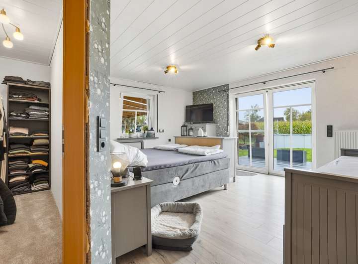 Hier befinden sich ein modernes Gäste-Bad sowie ein Schlafzimmer, wodurch ebenerdiges Wohnen problemlos möglich ist. Das helle und einladende Wohnzimmer bietet Zugang zur Terrasse – ideal für entspannte Stunden im Freien. Die angrenzende, ehemalige Küche verfügt ebenfalls über einen Terrassenzugang und wird als weiteres Schlafzimmer mit Ankleide genutzt.