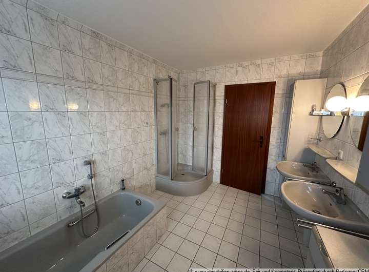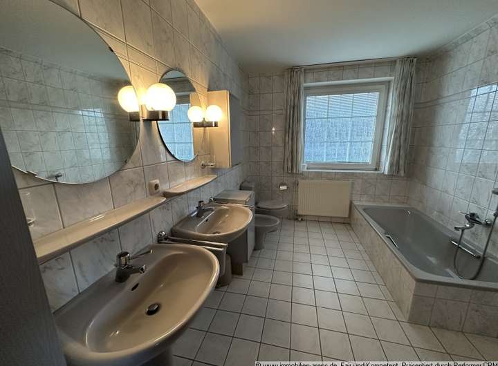 Obergeschoss Bad Fliesen, im Übrigen hochwertiger Laminatbodenbelag. Badezimmer im OG mit Badewanne, Dusche, 2 Waschbecken, WC, Bidet. Gäste-WC im EG mit Waschbecken.