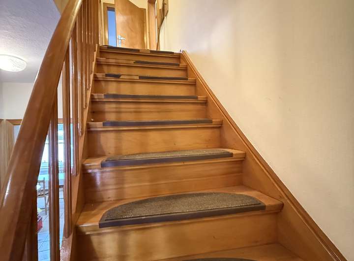 Vom Flur aus gelangt man über die Vollholztreppe in das OG, wo 2 weitere Schlafräume und ein Bad zur Verfügung stehen.