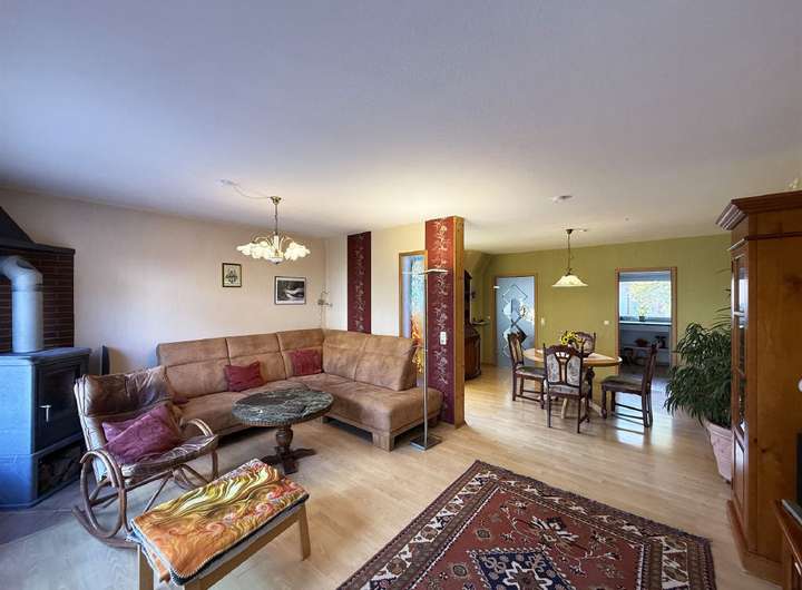 großes Wohn- und Esszimmer mit Holzofen und Zugang zur Terrasse, Küche,