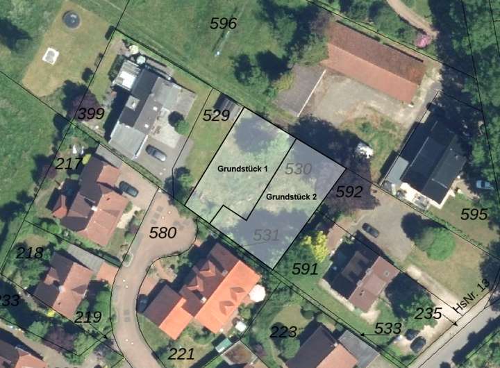 Variante 2: Teilung in zwei Parzellen mit jeweils ca. 341 m² und 368 m² zur Errichtung zweier Doppelhaushälften