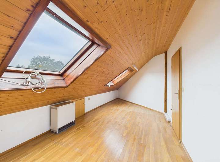Im Dachgeschoss stehen zwei weitere Zimmer, ein kleines Bad und ein großzügiger Stauraum bereit – ideal als Atelier, Jugendbereich oder ruhiger Rückzugsort.
