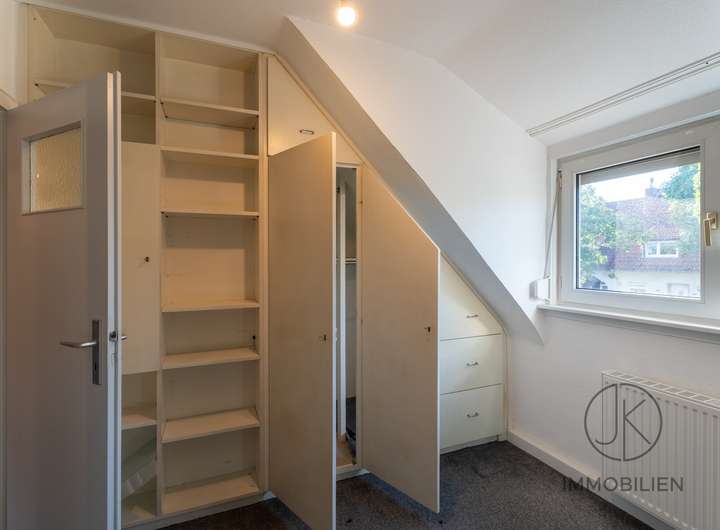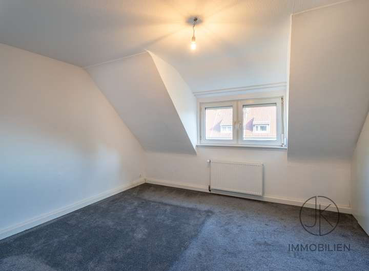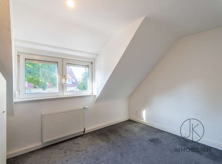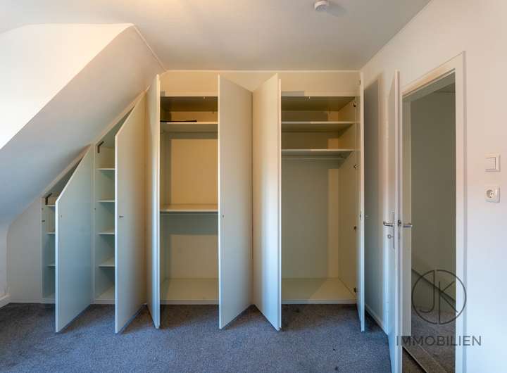 Im Dachgeschoss befinden sich zwei Schlafzimmer, die sich vielseitig nutzen lassen, etwa als Elternschlafzimmer, Kinderzimmer oder Homeoffice. Das Badezimmer ist zentral zwischen den Räumen angeordnet und in einem gepflegten, modernen Zustand. Der darüberliegende Spitzboden bietet zusätzliche Nutzfläche, die sich ideal als Stauraum eignet.