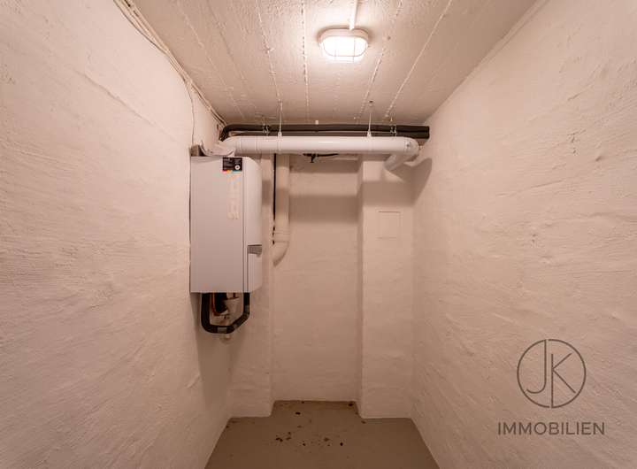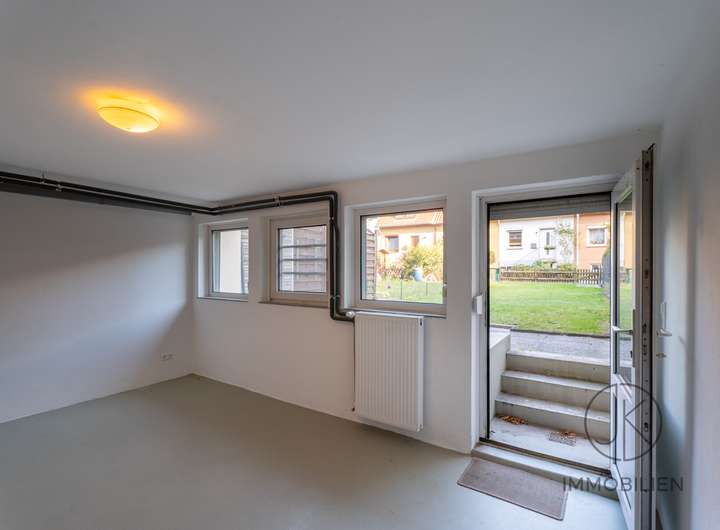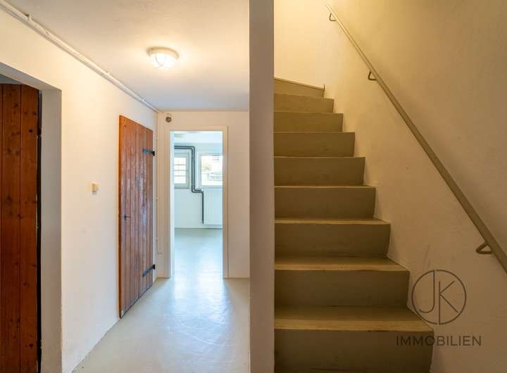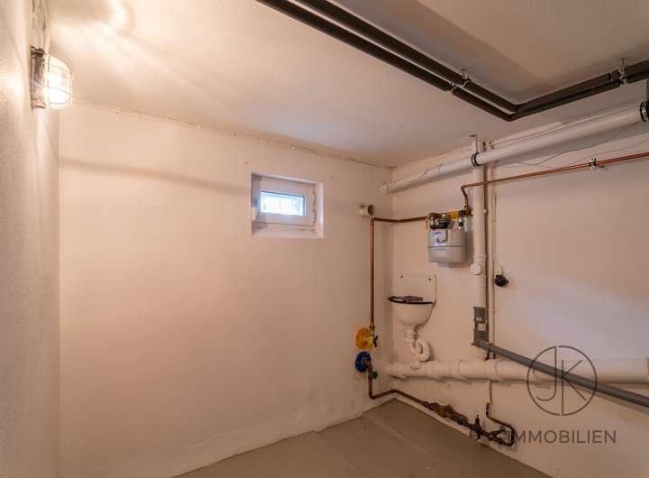 Vom Flur im Erdgeschoss führt eine Treppe in den voll unterkellerten Bereich, der die Nutzungsmöglichkeiten des Hauses sinnvoll erweitert. Hier befinden sich ein großer Hauswirtschaftsraum, ein separater Heizungsraum sowie ein weiterer großzügiger Raum, der wohnlich genutzt werden kann. Dieser Raum verfügt über einen direkten Ausgang in den Garten und eignet sich ideal als Büro, Gästezimmer oder Hobbyraum. Durch das vorhandene Tageslicht und den praktischen Gartenzugang entsteht hier ein angenehmer, vielseitig nutzbarer Bereich.