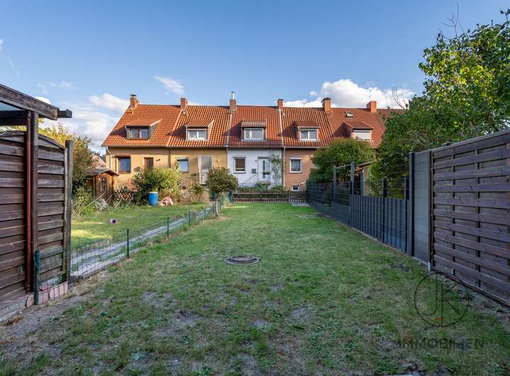 Der Garten ist gepflegt angelegt und bietet Raum für Erholung und Entspannung. Eine kleine Terrasse lädt an sonnigen Tagen zum Verweilen ein, während die Rasenfläche und der rückwärtige Zugang viel Komfort im Alltag schaffen. Über den hinteren Durchgangsweg ist das Grundstück ebenfalls erreichbar, ideal für Gartenarbeiten, Fahrräder oder einen separaten Zugang.
