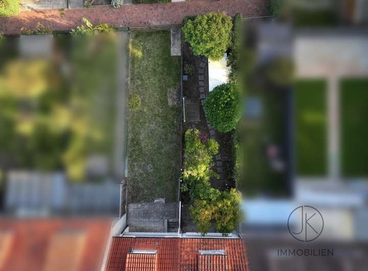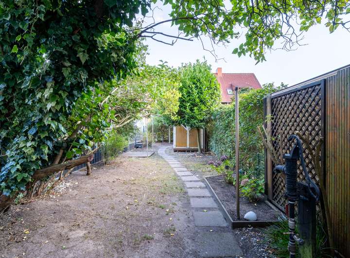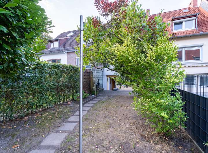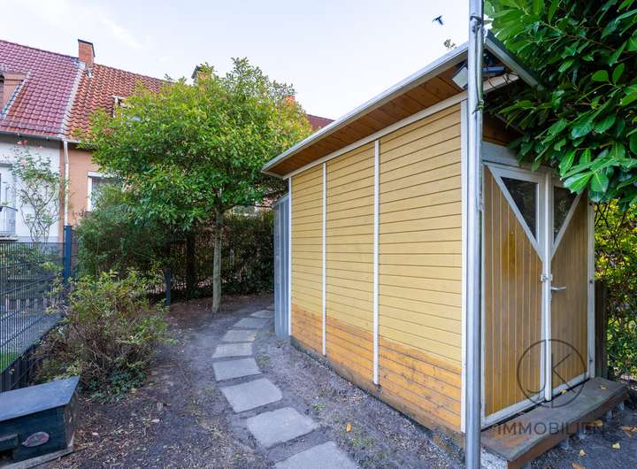 Der Garten ist gepflegt angelegt und bietet Platz für entspannte Stunden im Freien. Zusätzlich steht hier ein Gartenhäuschen zur Verfügung, das praktischen Stauraum für Gartengeräte oder Freizeitbedarf bietet. Über den hinteren Durchgangsweg ist das Grundstück ebenfalls erreichbar, ideal für den Zugang von außen oder den Transport von Gartenutensilien.