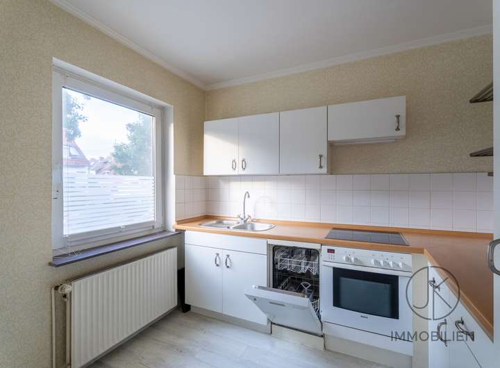 Im Erdgeschoss befinden sich der Eingangsflur, eine praktische Küche mit Blick zur Straßenseite sowie der großzügige Wohnbereich, der sich über die gesamte Hausbreite erstreckt. Die großen Fenster sorgen für eine freundliche Atmosphäre und bieten einen schönen Ausblick in den Garten. Der Raum bietet ausreichend Platz für eine gemütliche Wohnlandschaft und einen Essbereich.