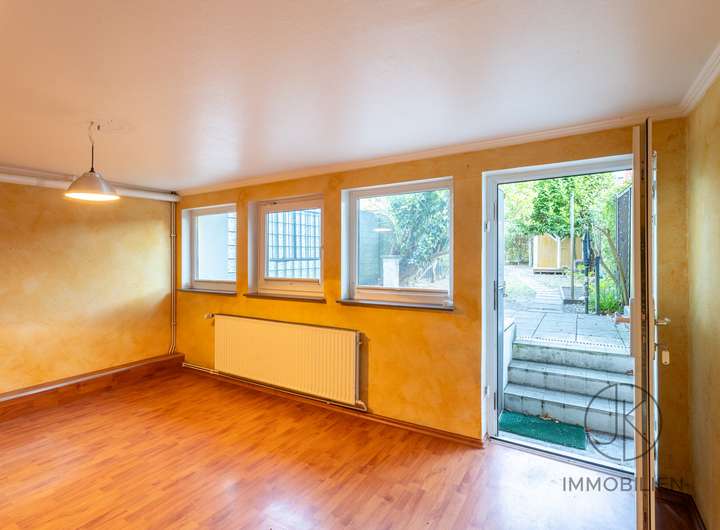 Vom Flur im Erdgeschoss führt eine Treppe in den voll unterkellerten Bereich, der den Wohnkomfort des Hauses erweitert. Hier befinden sich ein Heizungsraum, ein kombinierter Hauswirtschaftsraum mit Toilette und Waschbecken sowie ein weiterer großzügiger Raum, der wohnlich genutzt werden kann. Dieser Raum verfügt über einen direkten Ausgang zur Terrasse und in den Garten und eignet sich ideal als Büro, Gästezimmer oder Hobbyraum.