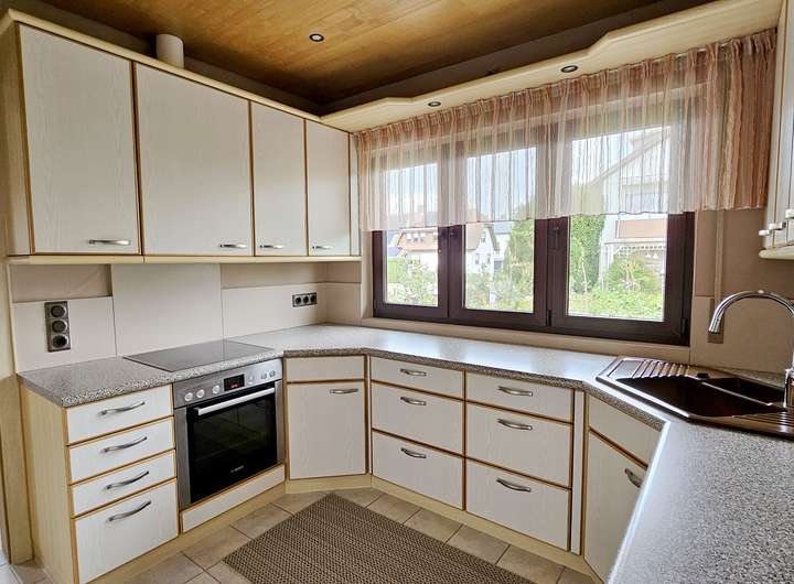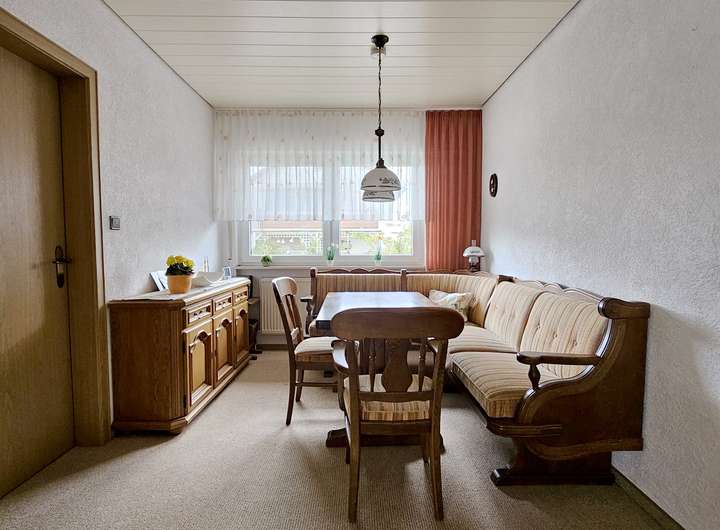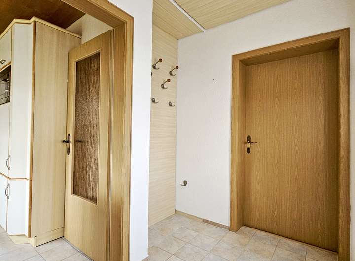 Über die Diele mit Garderobe gelangen Sie direkt in den großzügigen Wohnbereich sowie zum Gäste-WC. Die separate Küche liegt praktisch neben dem Essbereich und ist funktional ausgestattet – ideal für gemeinsame gesellige Abende.