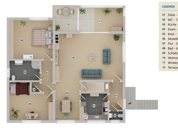 Der rund 35 m² große Wohnbereich bietet viel Platz und wird durch den angrenzenden, beheizten Wintergarten wunderbar ergänzt. Hier können Sie nach Feierabend einfach entspannen. Vom Wintergarten gelangen Sie direkt auf die Terrasse, die zu erholsamen Stunden an der frischen Luft einlädt.
