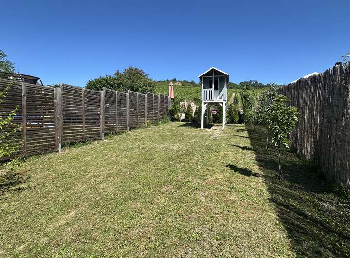 Der sonnige Garten lädt zum Verweilen ein und bietet Platz für entspannte Stunden im Grünen. Ob Frühstück auf der Terrasse mit Blick ins Grüne oder ein Spaziergang durch die Weinberge – hier wohnen Sie da, wo andere Urlaub machen.