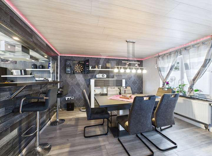 Im Erdgeschoss erstreckt sich ein einladender Wohn- und Essbereich, von dem aus Sie einen direkten Blick in die offen gestaltete Küche genießen können. Neue Kunststofffenster aus dem Jahr 2022 bieten hier hervorragende Lichtverhältnisse und tragen zur Wärmedämmung bei. Die moderne Küche erfüllt alle Ansprüche an zeitgemäßes Kochen und bildet zusammen mit dem lichtdurchfluteten Wohnraum das Herzstück des Hauses. Ergänzt wird das Raumangebot durch ein Gäste-WC sowie ein Badezimmer, das sich teilweise renovierungsbedürftig zeigt.