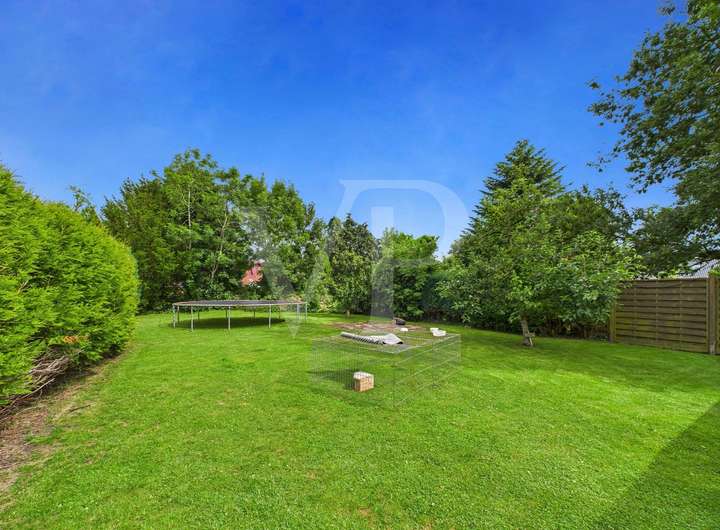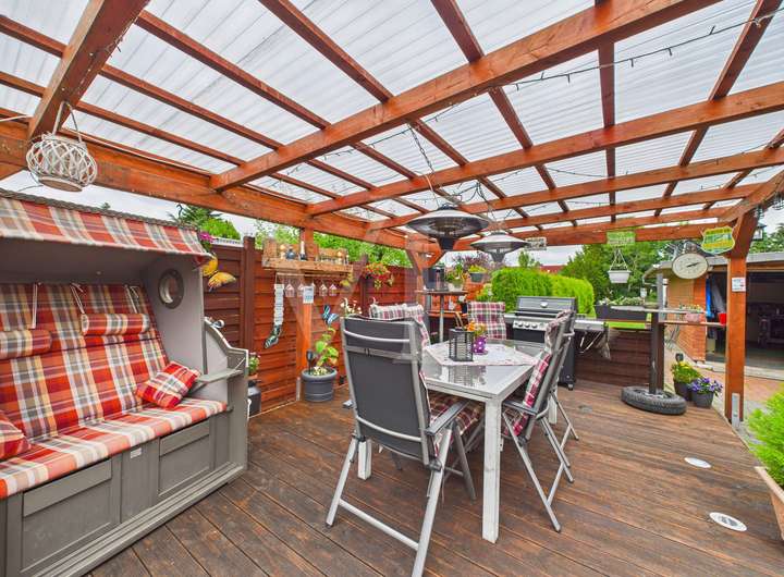 Der Garten verfügt über eine großzügige, überdachte Terrasse, die nahtlos in das weitläufige Grün übergeht – ideal für erholsame Stunden im Freien bei jedem Wetter. Eine separate Werkstatt bietet Bastlern und Heimwerkern vielfältige Möglichkeiten zur kreativen Entfaltung. Teilweise installierte Jalousien sorgen zusätzlich für angenehmen Sonnen- und Sichtschutz.